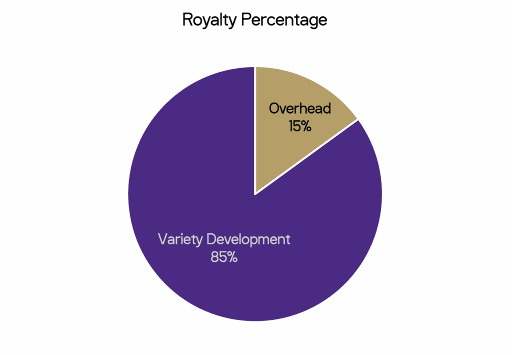 About 15% of the royalty funds go to administrative overhead. This includes overheads to the Department of Agronomy or Western Kansas Research Stations depending on where the variety was developed, the College of Agriculture, and Kansas State University Research Foundation. The other 85% of the royalty goes to variety development in some way or another.