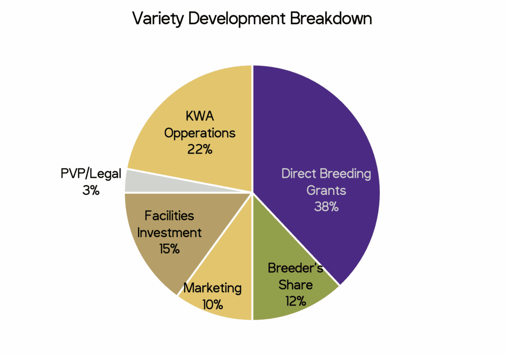 Of the portion that is put toward variety development, 38% of that goes directly towards breeding grants. This covers expenses like genetic screening, doubled haploid development, hiring student workers, and funding special projects related to wheat breeding. Another 12% of this portion is the inventors’ share, which supplements the salaries of the breeder and members of their team who helped develop the variety. Another 15% is used for equipment and facilities investment, including greenhouse equipment, combines, vehicles, planters, and more. As of the remaining funds; KWA operations are about 22%, marketing is 10%, and PVP and legal fees account for the last 3%.